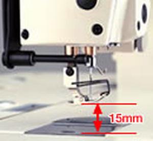 The machine ensures accurate stitch pitches (stitch length) as well as preventing slippage of the upper cloth thanks to the needle-feed mechanism which offers excellent efficiency of feed.